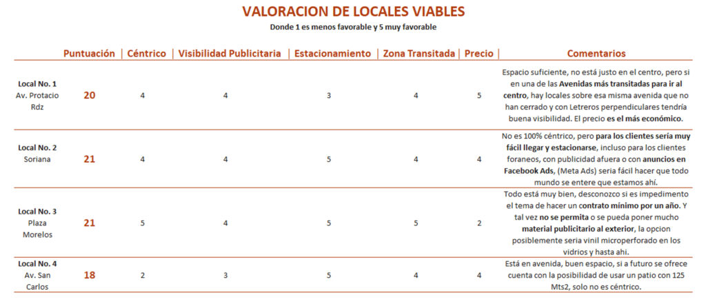 Durante la búsqueda, como se me indico, se omitieron los locales en Plaza La Estación y Plaza Los Naranjos, así como aquellos que no eran visibles dentro de plazas comerciales. Se presentan entonces las propuestas que cumplen con los requisitos, seguidas de los locales descartados por si es necesario considerarlos a futuro, junto con el motivo de su exclusión.