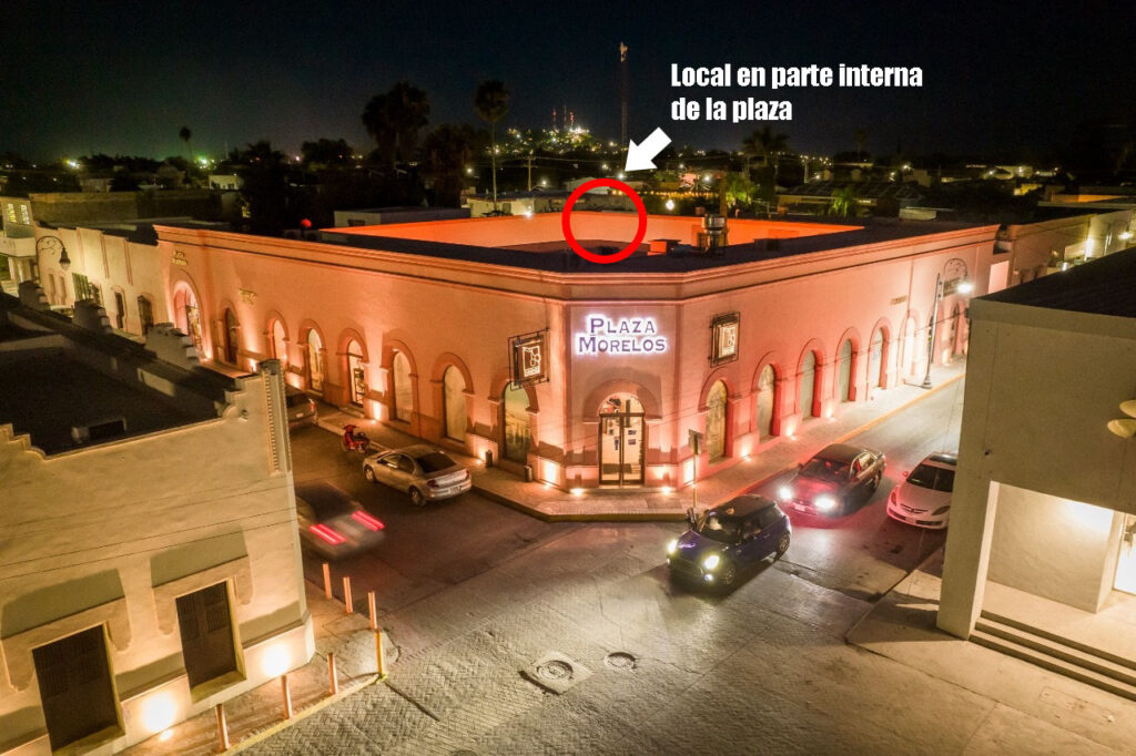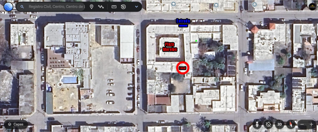 En la imagen anterior se observan las dos calles donde se ubica Plaza Morelos. El local en cuestión se encuentra al interior de la plaza, en la zona marcada en rojo. Esta área se encuentra en medio de la manzana, sin vista a la calle, lo que impide colocar publicidad visible al exterior, ya que se estaría invadiendo el espacio correspondiente a locales ajenos. Se observa mejor en la siguiente imagen.
